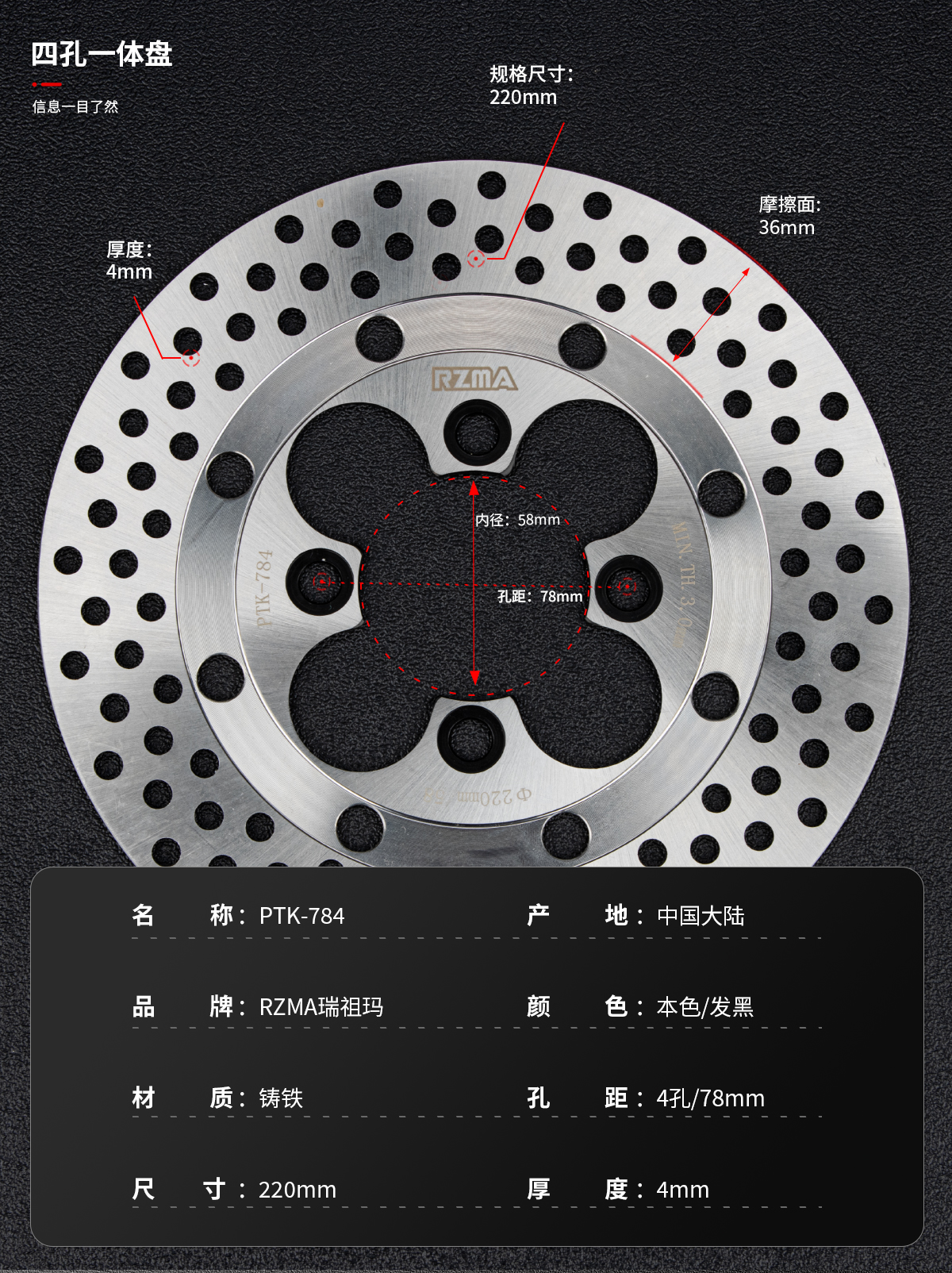 RZMA瑞祖玛四孔刹车盘220一体盘飞机声电动车摩托车制动升级改装
